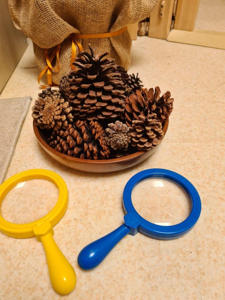 - Smaller loose parts: you can gather these together in small baskets for your child to explore
