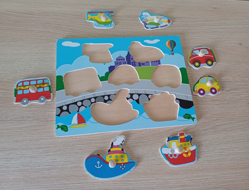 - Offer choices: remove the pieces and mix them up in a basket or bag, take out two at a time and let your child choose which one they would like to use next – for example ‘would you like the car or the bus?’